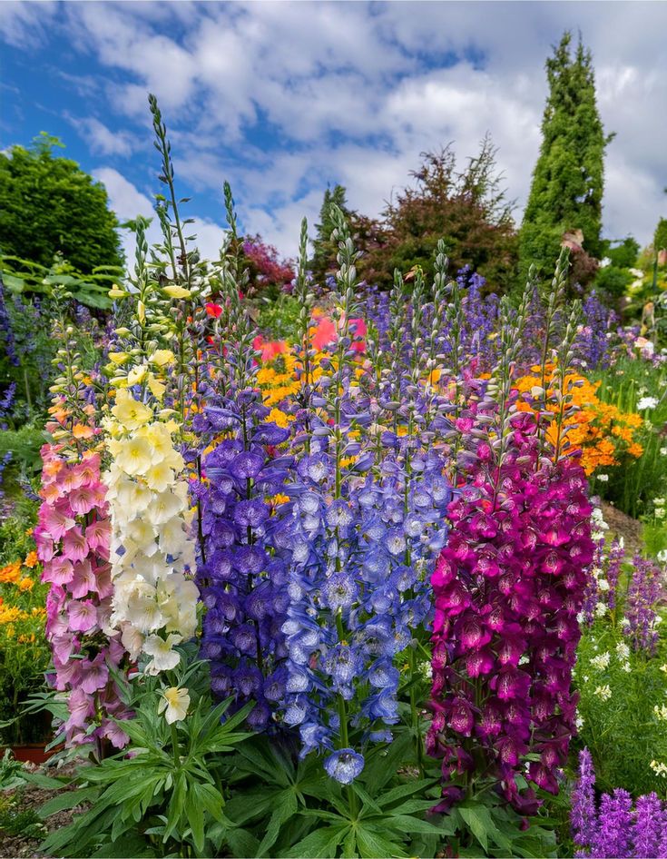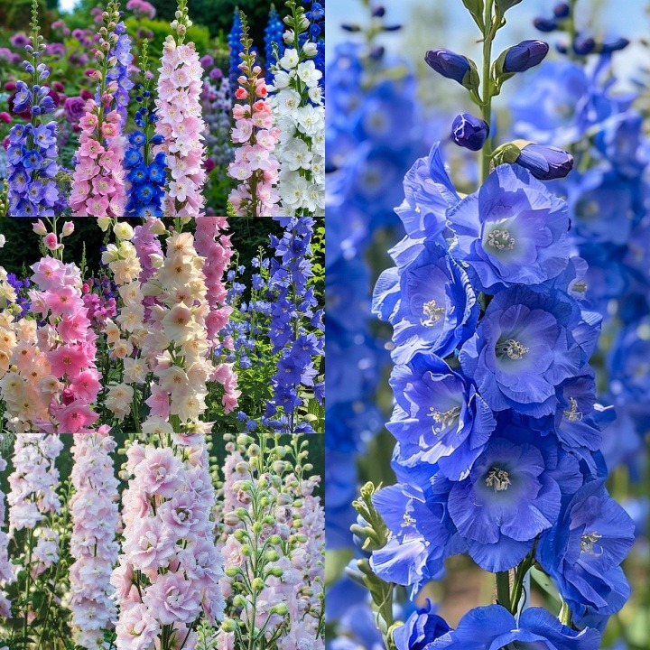 Суцвіття дельфініуму — це справжня окраса саду: великі, розкішні махрові кисті, щільно вкриті квітками діаметром 4–5 см.